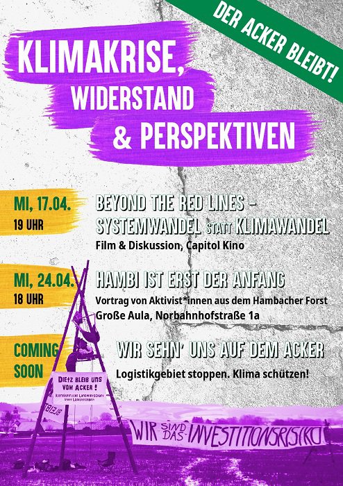 Für Veranstaltungen auf der Ackerbesetzung schauen Sie hier: http://www.ackerbleibt.org/aktuelles/programm